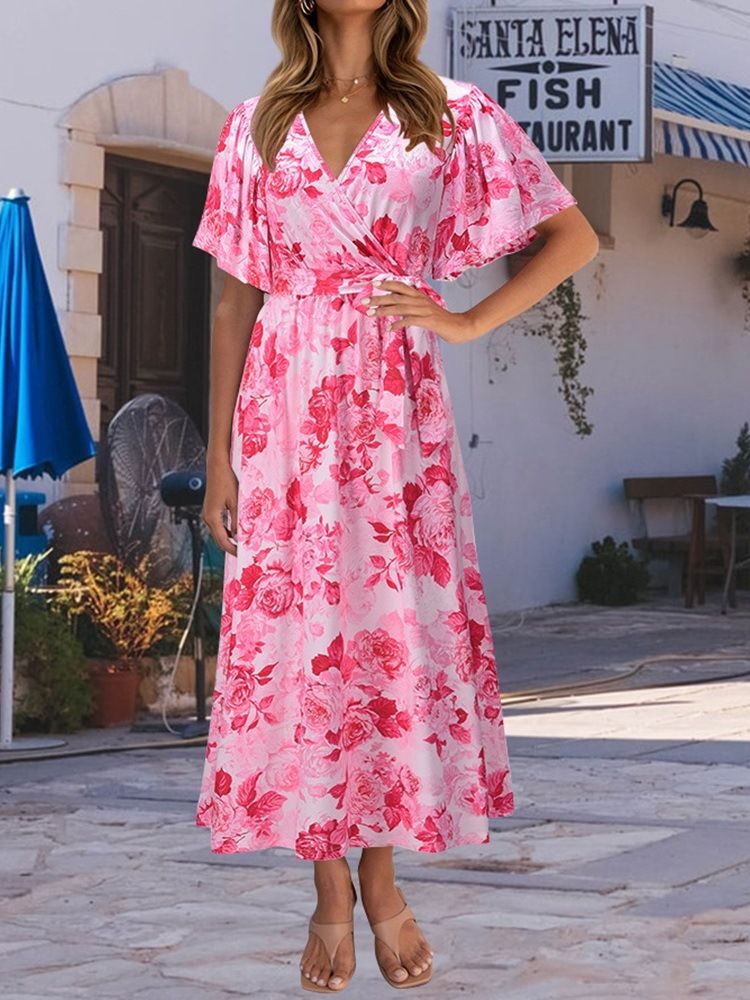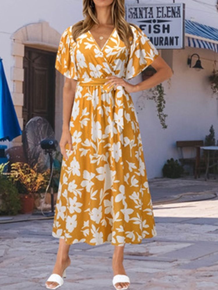 Ankel-lengde Snøring Kortermet Pullover A-linje Blomster Maxikjole Strandkjoler Til Kvinner