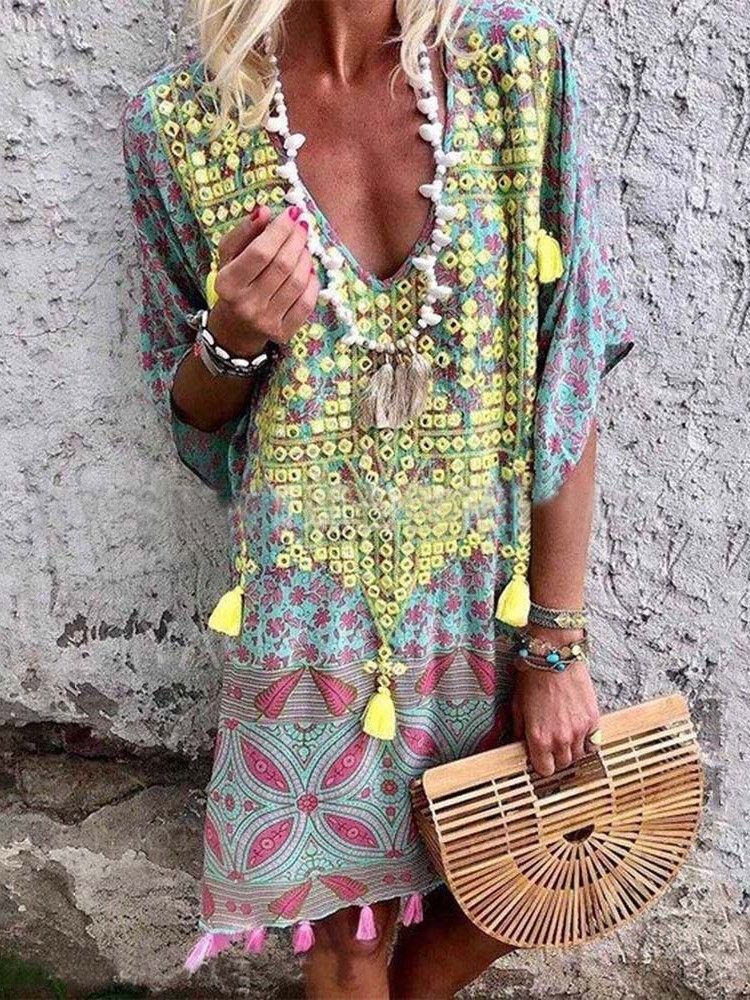 Bohemian V-hals Halvlange Ermet Kvast Midikjole For Strandkjoler For Kvinner