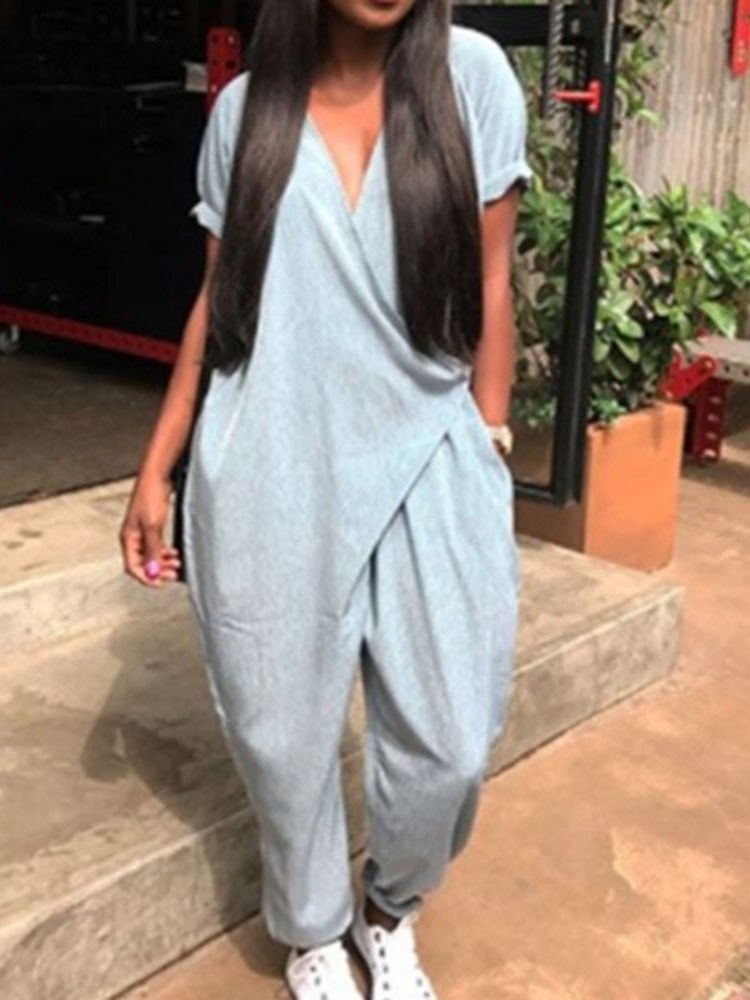 Casual Lace-up Plain Harem Pants Loose Jumpsuit For Kvinner
