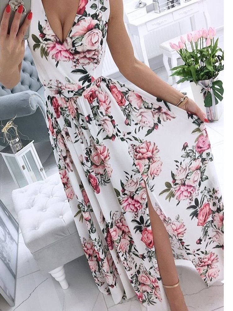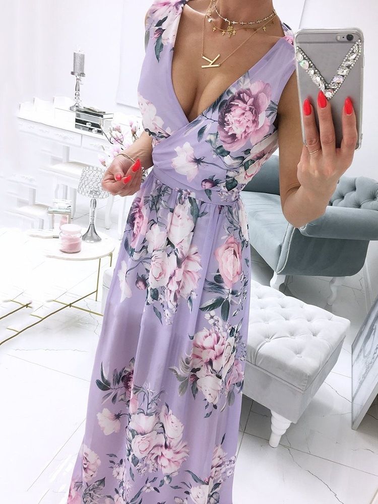 Ermeløs Gulvlengde V-hals Søt Blomsterkjole For Kvinner