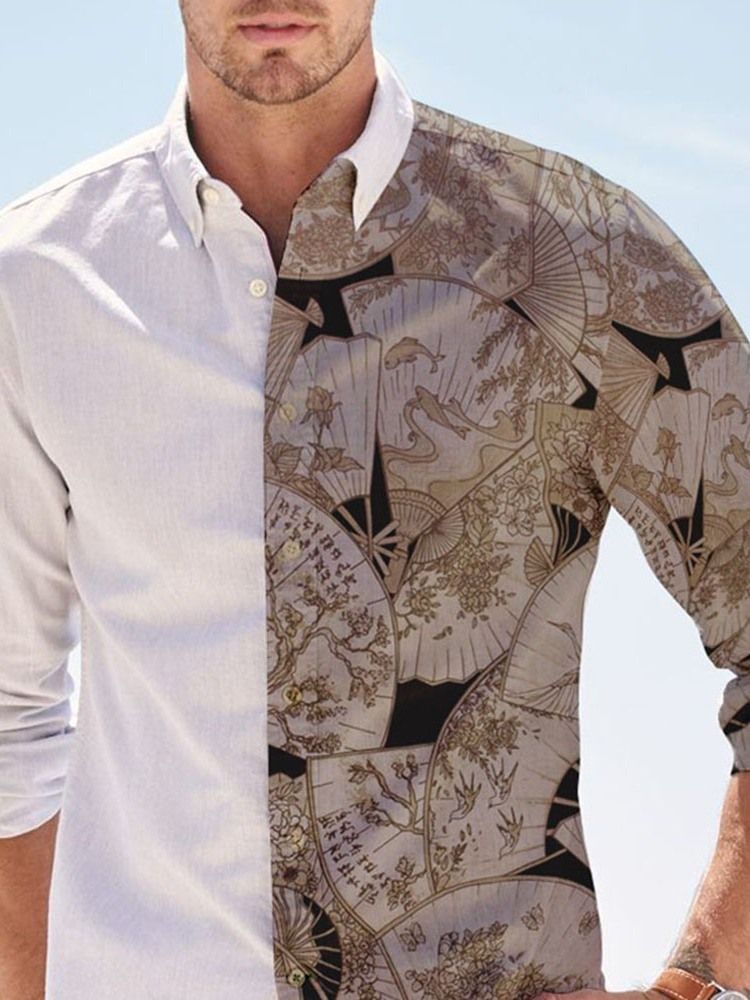 Folding Fan Print Lapel Color Block Slim Shirt For Menn