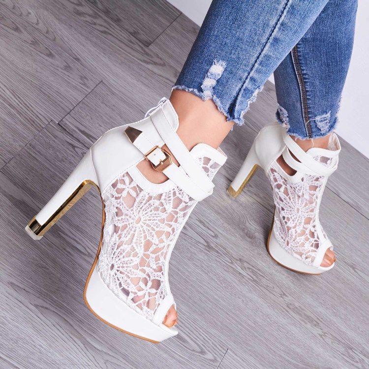 Kvinner Lace Detail Peep Toe White Heeled Platform Sandals