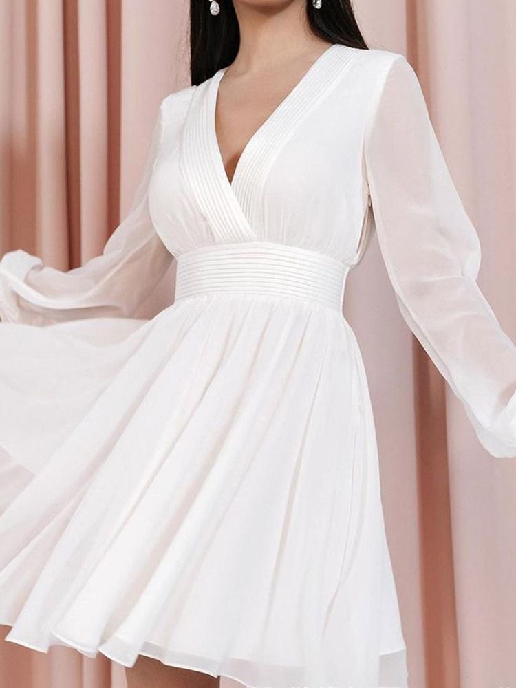 Kvinner V-hals Over Kneet Mesh Søt Genser Hvit Kjole