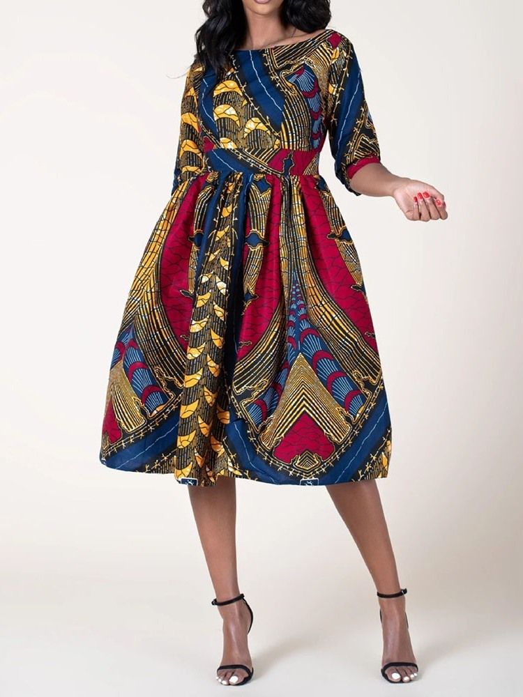 Kvinners Trykk Halv-ermet Rund Hals A-linje Fargeblokk Kjole